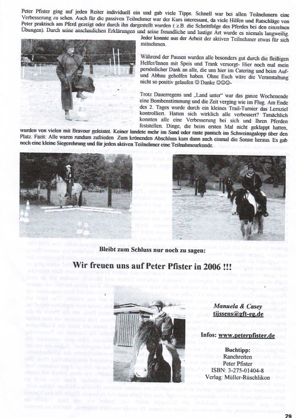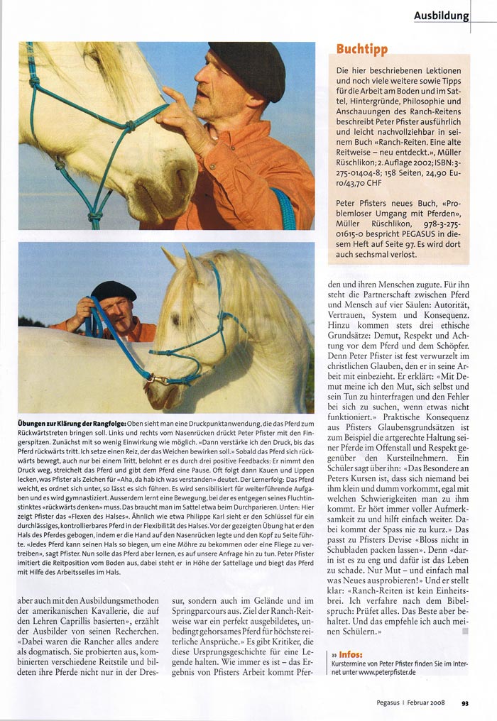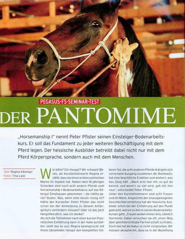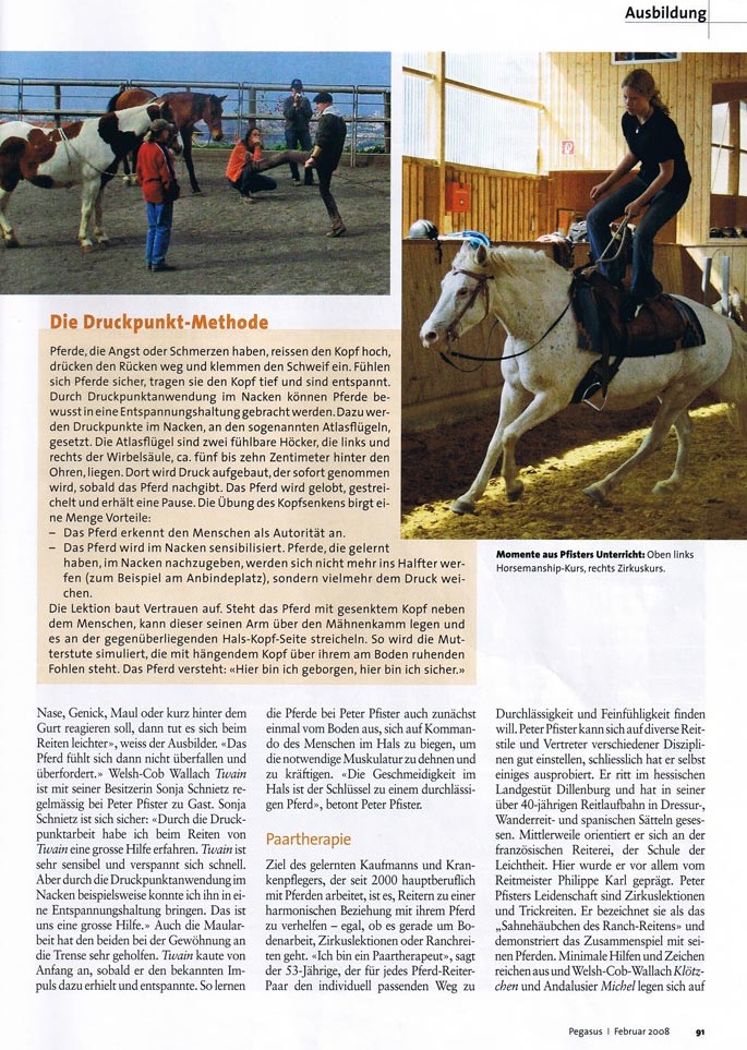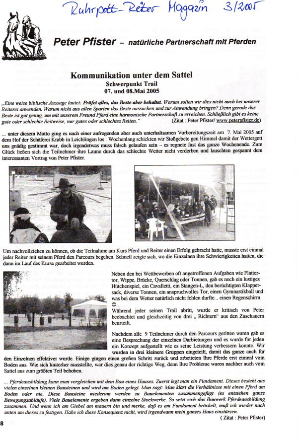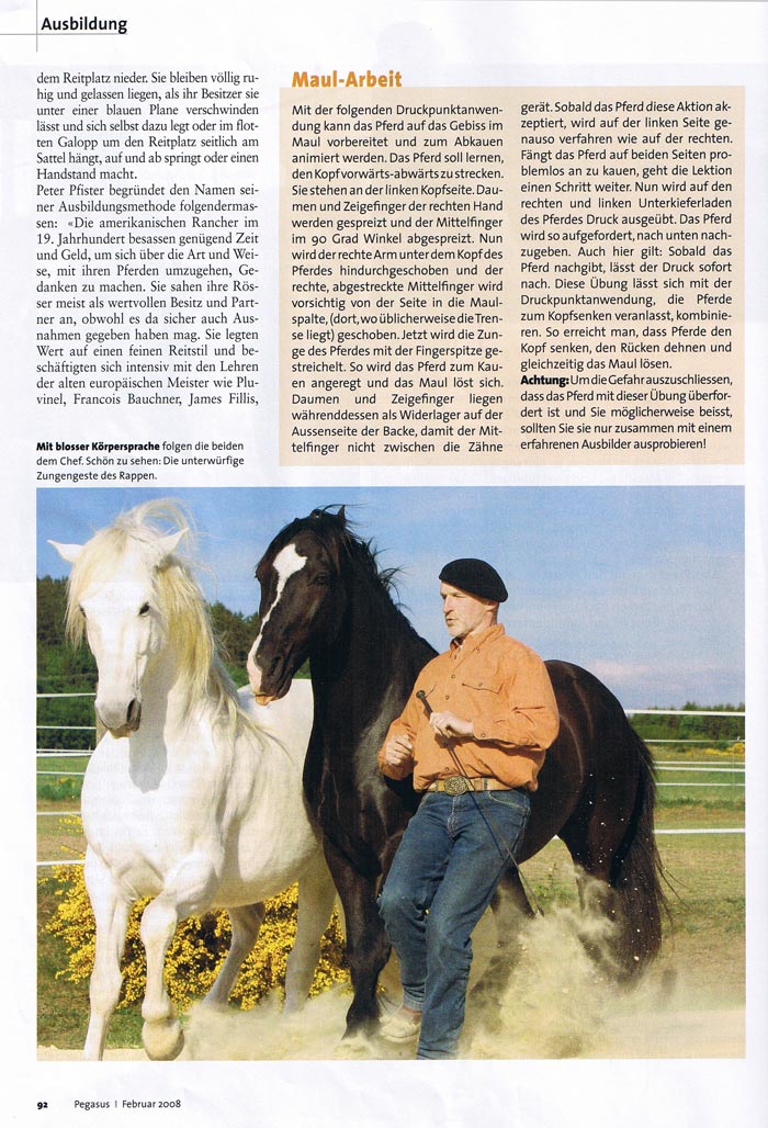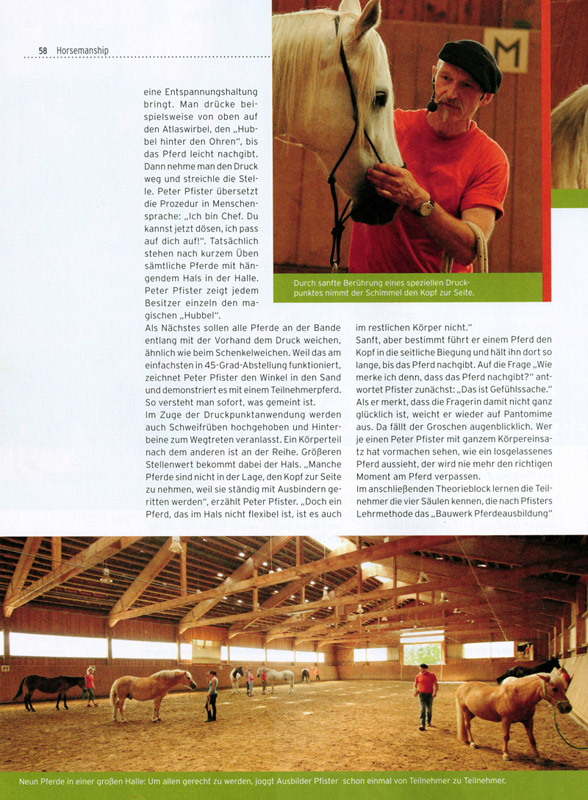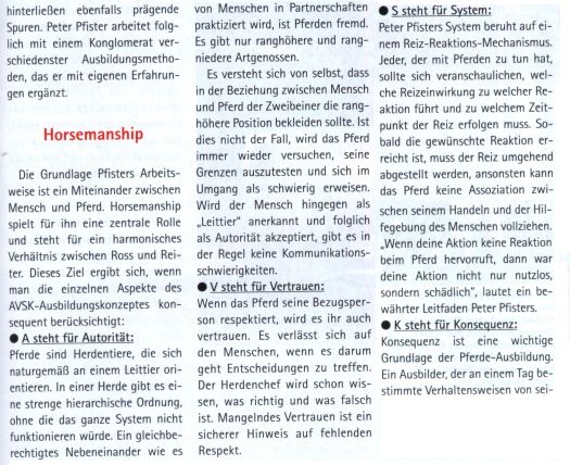 Es gibt keinen "Pfister-Spezial-Griff" oder irgendwelche Zubehör-Dinge, die man nur bei Dir kaufen kann, damit die Arbeit nach dem Kurs gelingt. Wohlverstanden: ich habe nichts gegen eine konsequent strukturierte Reitlehre oder die Möglichkeit, Bücher zu kaufen, die Details erklären. Aber es muss im Vordergrund stehen, wie bzw. warum etwas funktioniert und nicht ein Spezialbegriff mit einer geschickten Vermarktung.
