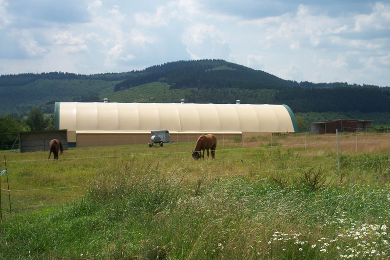 Jahre später, die Kinder waren inzwischen erwachsen, stellte sich die Frage nach einer Betriebserweiterung. Nach langer Vorbereitungszeit konnte im November 2008 die Reithalle aufgestellt werden. Neben einer Reitfläche von 20 x 40 Meter befinden sich im Vorraum dieser Halle sieben Boxen, darüber ein gemütlichen Seminarraum mit direktem Blick auf die Halle, eine Zuschauergalerie und unser kleiner Sattelshop.